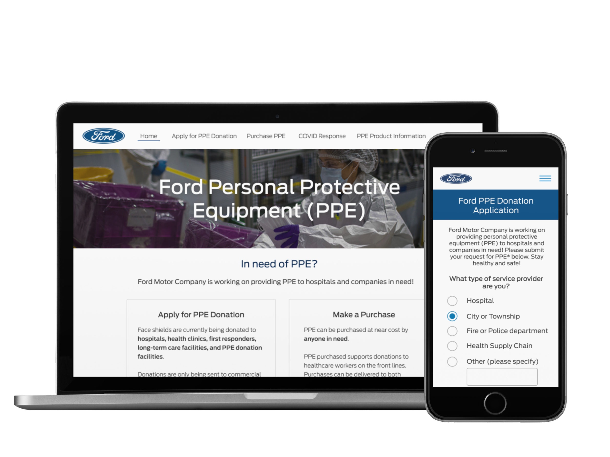 At the beginning of the COVID-19 pandemic in 2020, Ford led the way by producing and distributing personal protective equipment (PPE), including ventilators, gowns, and face shields. I served as the designer for the sites to request and purchase PPE from Ford. The site was designed and developed in a span of two weeks due to the urgent need to distribute masks and face shields.